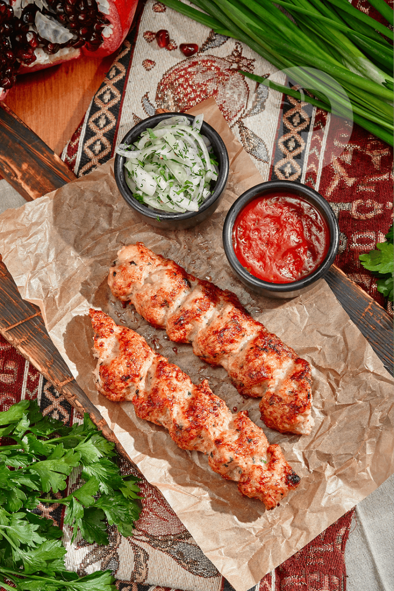 В состав блюда входит: люля-кебаб из говядины (180 гр). Подается с маринованным луком (20 гр) и томатным соусом (30 гр).
