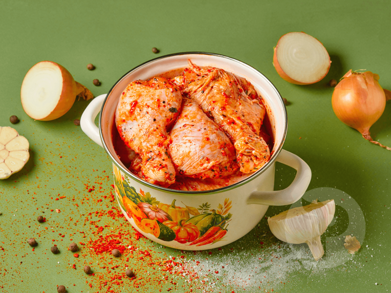 Состав: мясо курицы в свежей мариновке (лук репчатый, масло растительное, паприка, сухой базилик, соль), фирменный рецепт - вкусно и сочно! Подается с соусом томатным 150 грамм.