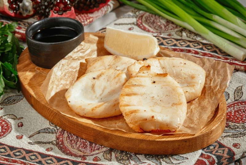 В состав блюда входит: кальмар маринованный (150 гр), соус азиатский (30 гр), лимон (20 гр).