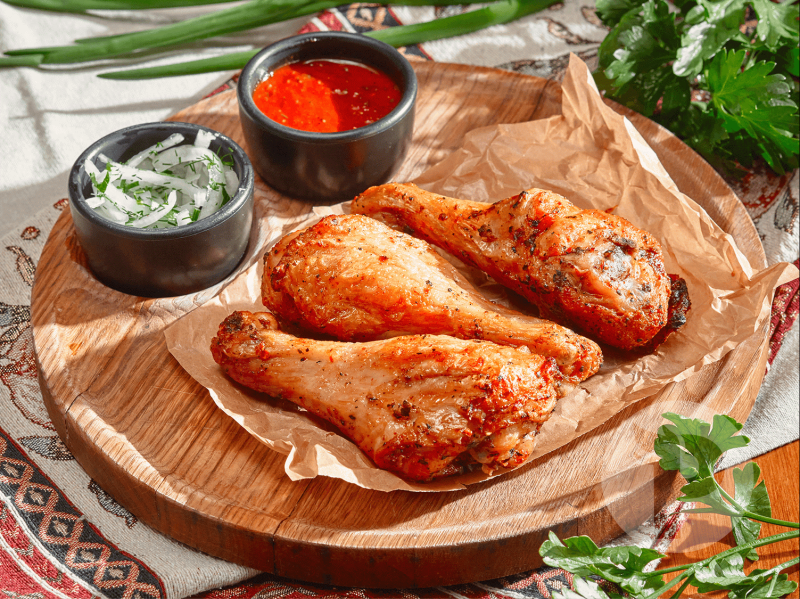 В состав блюда входит: голень куриная 3 шт. Подается с маринованным репчатым луком (20 гр) и томатным соусом (30 гр).