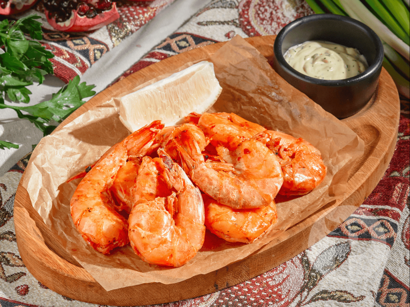 В состав блюда входит: креветки гриль (150 гр), лимон (20 гр), соус чесночный (30 гр).
