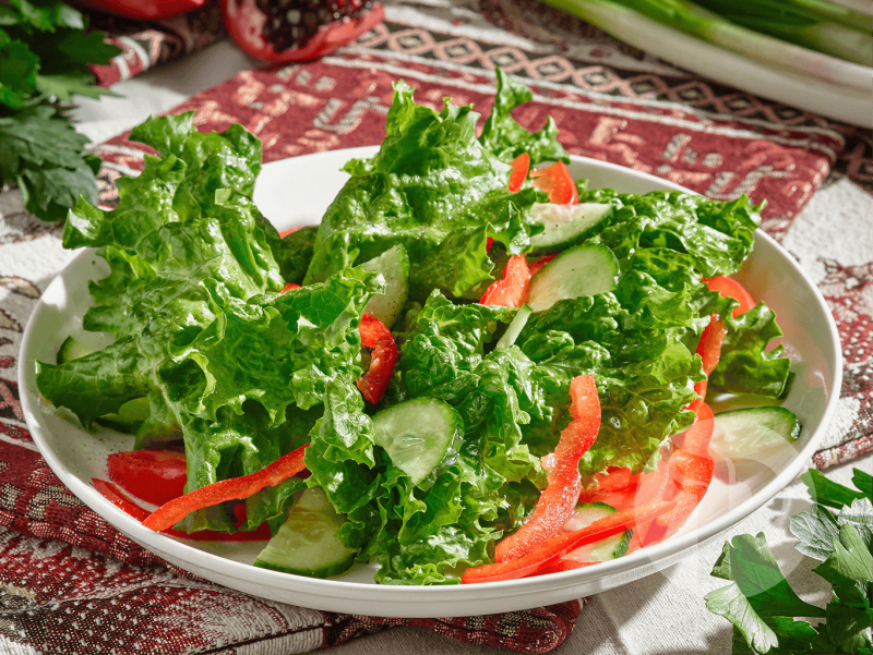 В состав блюда входит: спелые помидоры, хрустящий огурец, свежие салатные листья и сочный болгарский перец, заправлены растительным маслом и специями.
