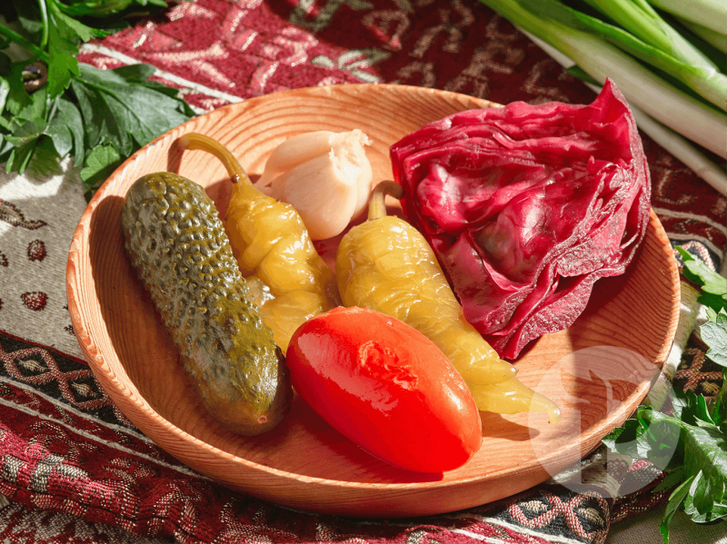 В состав блюда входит: маринованные помидоры красные, огурцы, перец, чеснок, капуста.