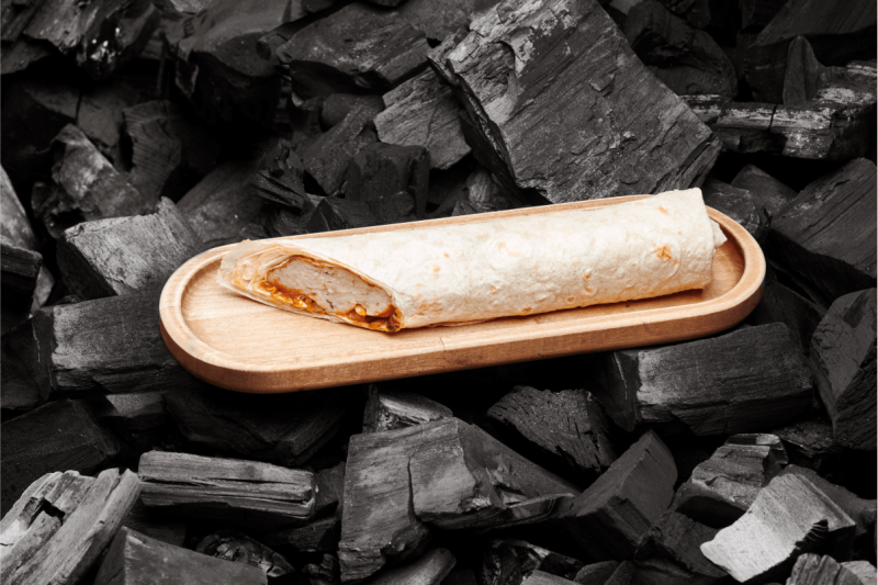 В состав блюда входит: шашлык говяжий толстый край в лаваше. Подается с маринованным репчатым луком и томатным соусом и аджикой.